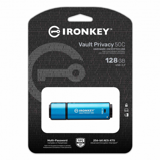 Kingston IronKey™ Vault Privacy řady 50C jsou špičkové disky USB Type-C®, které zajišťují zabezpečení Enterprice-Grade úrovně pomocí 256bitového hardwarového šifrování AES s certifikací FIPS 197 v režimu XTS, včetně zabezpečení proti BadUSB pomocí digitálně podepsaného firmwaru a ochrany proti útoku na heslo hrubou silou. Na VP50 byly provedeny zkoušky prolomení pro zabezpečení na Enterprice-Grade úrovni Vzhledem k tomu, že se jedná o šifrované úložiště pod fyzickou kontrolou uživatele, je řada VP50 při ochraně dat lepší než používání internetu a cloudových služeb.