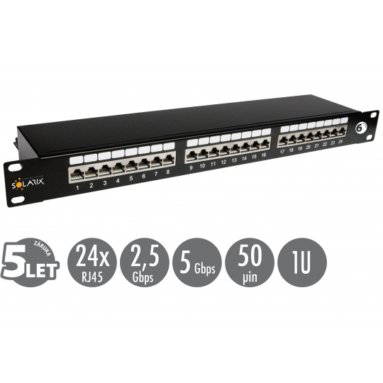 Patch panel Solarix s označením SX24-6-STP-BK je stíněný panel kategorie 6, který je osazen 24 porty RJ45 a duální IDC svorkovnicí 110/Krone. Kontakty jsou na svorkovnici odlišeny barvami podle typu zapojení, a to buď podle standardu T568A, nebo T568B. Tento panel z produktové řady Solarix – kategorie 6 bez problémů splňuje a rovněž převyšuje požadavky definované v mezinárodních standardech ANSI/TIA 568, ISO/IEC 11801 a EN 50173 pro kategorii 6 a třídu vedení Class E, včetně všech nejnovějších dodatků. Panel je navrhnut tak, aby byl robustní, spolehlivý, poskytoval maximální výkon a umožňoval jednoduchou instalaci. Součástí těla panelu je vyvazovací lišta, která umožňuje pevné uchycení a přehledné uspořádání datového kabelu. Barva stíněného patch panelu Solarix kategorie 6 je černá; velikost v datovém rozvaděči je 1U.