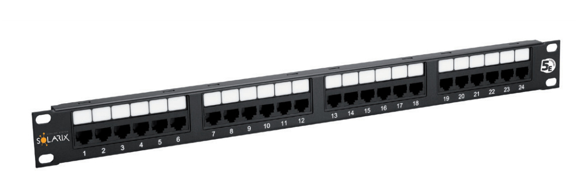 Nestíněné patch panely produktové řady Solarix – kategorie 5E jsou dodávány v provedení 12, 24 a 48 portů RJ45 a jsou osazeny moduly s duální IDC svorkovnicí typu 110/Krone. Každý kontakt je na této svorkovnici z důvodu snadného zakončení kabelu označen barvami podle typu zapojení, a to buď podle standardu T568A, nebo T568B. Tyto komponenty strukturované kabeláže Solarix jsou vyrobeny tak, aby zaručovaly dlouhou životnost, vynikající funkčnost a především spolehlivost. Nestíněné patch panely Solarix – kategorie 5E jsou testovány až do šířky pásma 150 MHz a převyšují tak požadavky na komponenty kategorie 5E/Class D definované v mezinárodních normách ANSI/TIA 568, ISO/IEC 11801 a EN 50173, včetně všech nejnovějších dodatků. Standardní barva patch panelů je černá. Velikost v datovém rozvaděči je 1U.