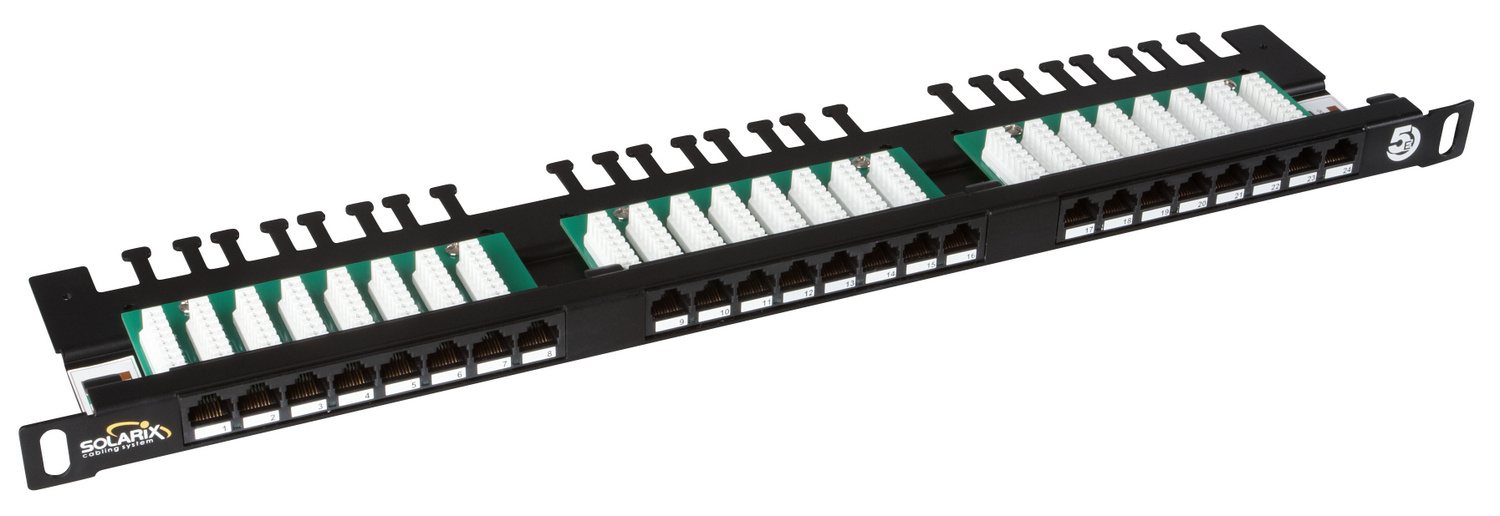Patch panely Solarix s označením SX24HD-5E-UTP-BK jsou vysokohustotní 19" patch panely s výškou 0,5U, které jsou osazeny 24 porty RJ45 a duální IDC svorkovnicí 110/Krone. U těchto panelů je důraz kladen na maximální úsporu místa v rozvaděči, kdy do výšky 1U lze jednoduše nainstalovat až 48 portů. Tyto high-density panely Solarix jsou dostupné ve stíněném i nestíněném provedení a bez problémů splňují požadavky definované v mezinárodních standardech ANSI/TIA 568, ISO/IEC 11801 a EN 50173 včetně všech nejnovějších dodatků pro kategorii 5E a třídu vedení Class D. Panely jsou navrhnuty tak, aby byly robustní, spolehlivé, poskytovaly maximální výkon a umožňovaly jednoduchou instalaci. Součástí těla těchto panelů je vyvazovací lišta, která umožňuje pevné uchycení a přehledné uspořádání datového kabelu. Barva nestíněného high-density patch panelu Solarix je černá.