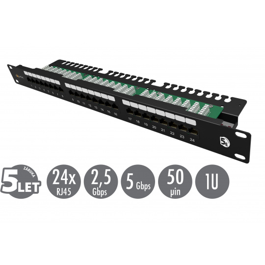Patch panel Solarix s označením SX24L-5E-UTP-BK-N je panel osazený 24 porty RJ45, jehož součástí je vyvazovací lišta sloužící k přehlednému vyvázání a pevnému uchycení kabelů přímo k tělu panelu. Instalační kabel se zakončuje do duální IDC svorkovnice typu 110/Krone. Svorkovnice je z důvodu snadného zakončení kabelu označena podle standardu T568A i T568B. Stejně jako všechny ostatní komponenty strukturované kabeláže Solarix je tento panel vyroben tak, aby zaručoval maximální životnost, velmi dobrou funkčnost a především vysokou spolehlivost. Tento patch panel Solarix splňuje požadavky na komponenty kategorie 5E a třídy vedení Class D, které jsou definovány ve standardech ANSI/TIA 568, ISO/IEC 11801 a EN 50173, a to včetně všech nejnovějších dodatků. Barva patch panelu je černá; velikost v datovém rozvaděči je 1U. Součástí balení je 4x M6 montážní sada, a 24x vyvazovací pásek. Tento nový patch panel Solarix nahrazuje panel s označením SX24L-5E-UTP-BK.