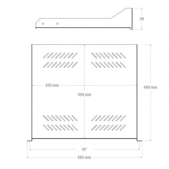 Polička s perforací 19" 2U 400 mm - 19" nízkoprofilová police 400 mm s uchycením 2U je vhodná pro umístění do 19" datového rozvaděče s hloubkou 600 mm a hlubšší. - Perforované tělo police umožňuje proudění vzduchu. - Tato police se instaluje pouze na přední vertikální lišty datového rozvaděče. TECHNICKÉ VLASTNOSTI Celková hloubka police: 400 mm Výška uchycení v rozvaděči:: 2U Rozměr úložné plochy police: (š) 435 mm x (h) 390 mm Max. nosnost police: 30 kg Rozměry: (v) 100 mm x (š) 510 mm x (h) 420 mm Hmotnost: 2,32kg Součástí balení je příbal pro uchycení v rozvaděči: 4x klecová matice M6, 4x šroub M6
