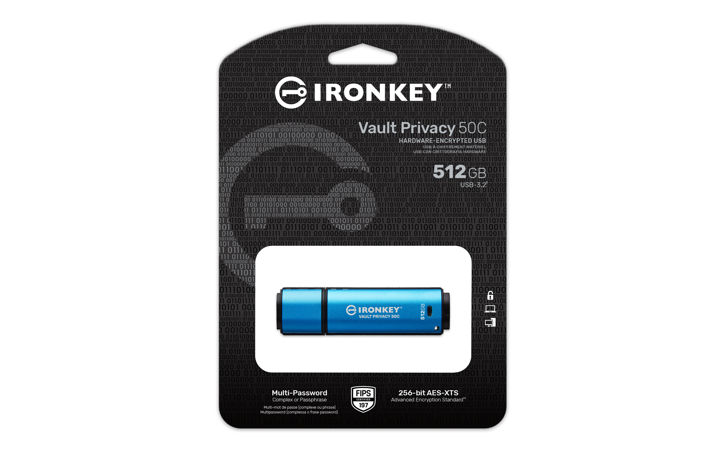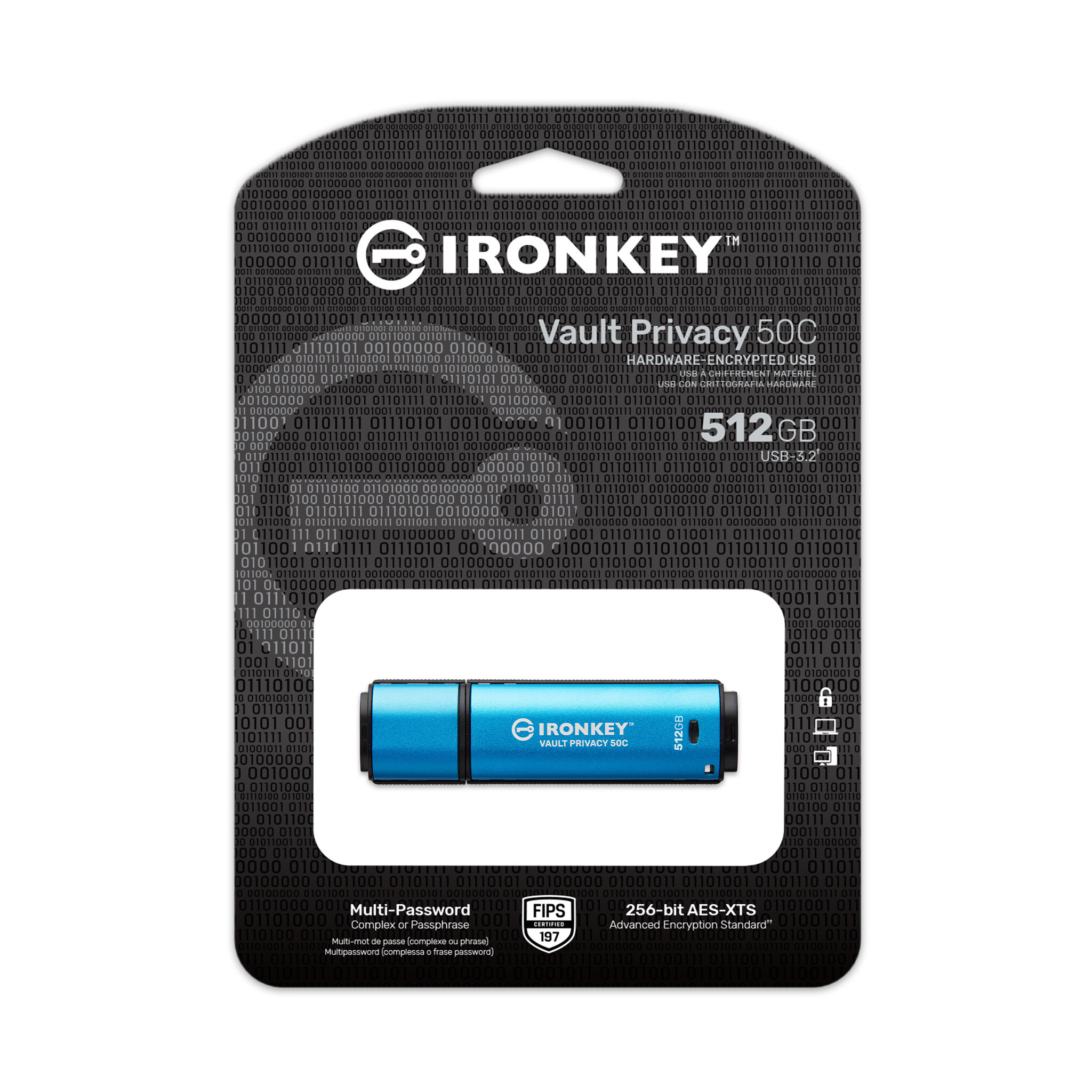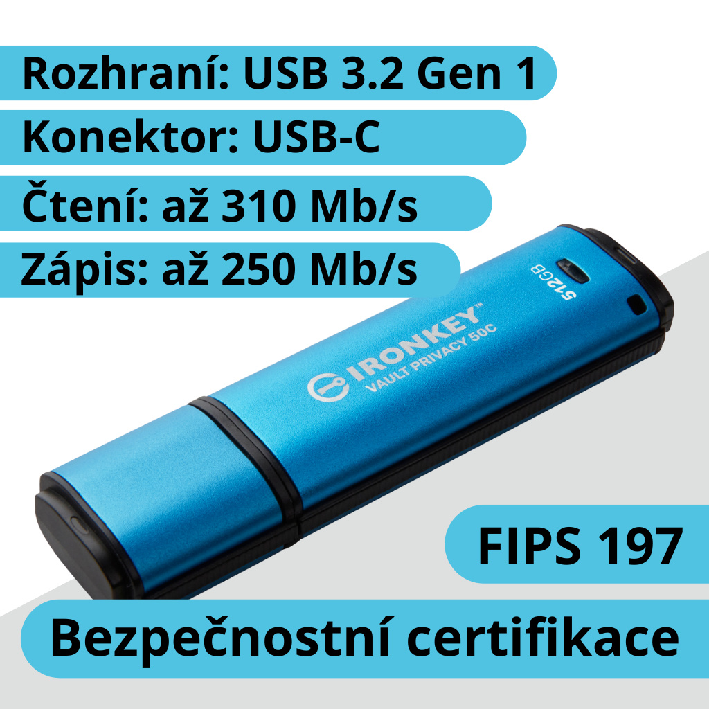 Kingston IronKey™ Vault Privacy řady 50C jsou špičkové disky USB Type-C®, které zajišťují zabezpečení Enterprice-Grade úrovně pomocí 256bitového hardwarového šifrování AES s certifikací FIPS 197 v režimu XTS, včetně zabezpečení proti BadUSB pomocí digitálně podepsaného firmwaru a ochrany proti útoku na heslo hrubou silou. Na VP50 byly provedeny zkoušky prolomení pro zabezpečení na Enterprice-Grade úrovni Vzhledem k tomu, že se jedná o šifrované úložiště pod fyzickou kontrolou uživatele, je řada VP50 při ochraně dat lepší než používání internetu a cloudových služeb.