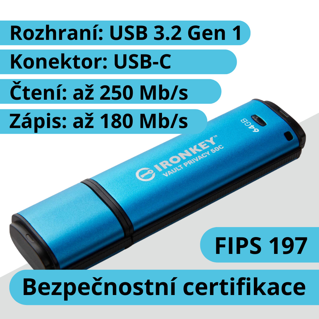 Kingston IronKey™ Vault Privacy řady 50C jsou špičkové disky USB Type-C®, které zajišťují zabezpečení Enterprice-Grade úrovně pomocí 256bitového hardwarového šifrování AES s certifikací FIPS 197 v režimu XTS, včetně zabezpečení proti BadUSB pomocí digitálně podepsaného firmwaru a ochrany proti útoku na heslo hrubou silou. Na VP50 byly provedeny zkoušky prolomení pro zabezpečení na Enterprice-Grade úrovni Vzhledem k tomu, že se jedná o šifrované úložiště pod fyzickou kontrolou uživatele, je řada VP50 při ochraně dat lepší než používání internetu a cloudových služeb. Úložiště Vault Privacy 50 podporuje možnost více hesel (admin, uživatel a jednorázové obnovení) s režimy fráze nebo komplexního přístupového hesla. To zlepšuje možnosti obnovení přístupu k datům, pokud je zapomenuto jedno z hesel. Tradiční režim komplexního hesla umožňuje tvorbu hesel v délce 6–16 znaků s využitím 3 ze 4 znakových sad. Režim přístupového hesla fráze umožňuje využití číselného kódu PIN, věty, seznamu slov nebo zapamatovatelného citátu v délce 10 až 64 znaků. Správce může povolit uživatele a heslo pro jednorázové obnovení nebo resetovat heslo uživatele pro obnovení přístupu k datům. Pro usnadnění zadávání hesla lze aktivovat symbol „oka“, který odkryje zadávané heslo, čímž se omezí překlepy vedoucí k neúspěšným pokusům o přihlášení. Ochrana proti útokům hrubou silou zablokuje uživatelská hesla nebo hesla pro jednorázovou obnovu po 10 neplatných heslech zadaných v řadě a šifrovaně vymaže disk, pokud je heslo správce 10× za sebou zadáno nesprávně. Pro ochranu před potenciálním malwarem na nedůvěryhodných systémech může správce i uživatel nastavit režim pouze pro čtení, aby byl disk chráněn proti zápisu; vestavěná virtuální klávesnice navíc chrání hesla před keyloggery nebo screenloggery. Organizace mohou disky řady VP50 přizpůsobovat a konfigurovat pomocí ID produktu (PID) pro integraci se standardním softwarem pro správu koncových bodů, aby splnily požadavky podnikového IT a požadavky na kybernetickou bezpečnost prostřednictvím programu Kingston Customization Program. Malé a střední podniky mohou používat roli správce pro místní správu svých disků, např. používat správce pro konfiguraci nebo resetování uživatelských hesel zaměstnanců nebo hesel pro jednorázové obnovení, obnovení přístupu k datům na uzamčených discích a splnění zákonů a předpisů pro případy forenzní analýzy. Vault Privacy 50 je rychlý a nabízí dvoukanálový výkon ve všech kapacitách. Disk je vodotěsný s krytím IPX8, kompatibilní s TAA a byl vyroben v USA. *Bezpečnostní certifikace: FIPS 197 - Zabezpečení schválené společností SySS GmbH (Prolomení testováno pro zabezpečení na Enterprise-Grade úrovni) *Voděodolnost: IEC 60529 IPX8 do 120cm ( platí s nasazeným krytem. Před použitím musí být výrobek čistý a suchý) *Rozhraní: USB 3.2 Gen1 typ C *Rychlost čtení: 250 MB/s *Rychlost zápisu: 180MB/s *Operační teplota: 0°C to 50°C *Skladovací teplota: -20°C to 85°C *Rozměry: 77.9 mm x 21.9 mm x 12.0 mm *Váha: 15g *Kompatibilita: Windows 11, 10, macOS 11.x – 14.x *Záruka: 5 let Pro podrobnější informace k šifrování nebo technickou radu se obraťte na Kingston.com