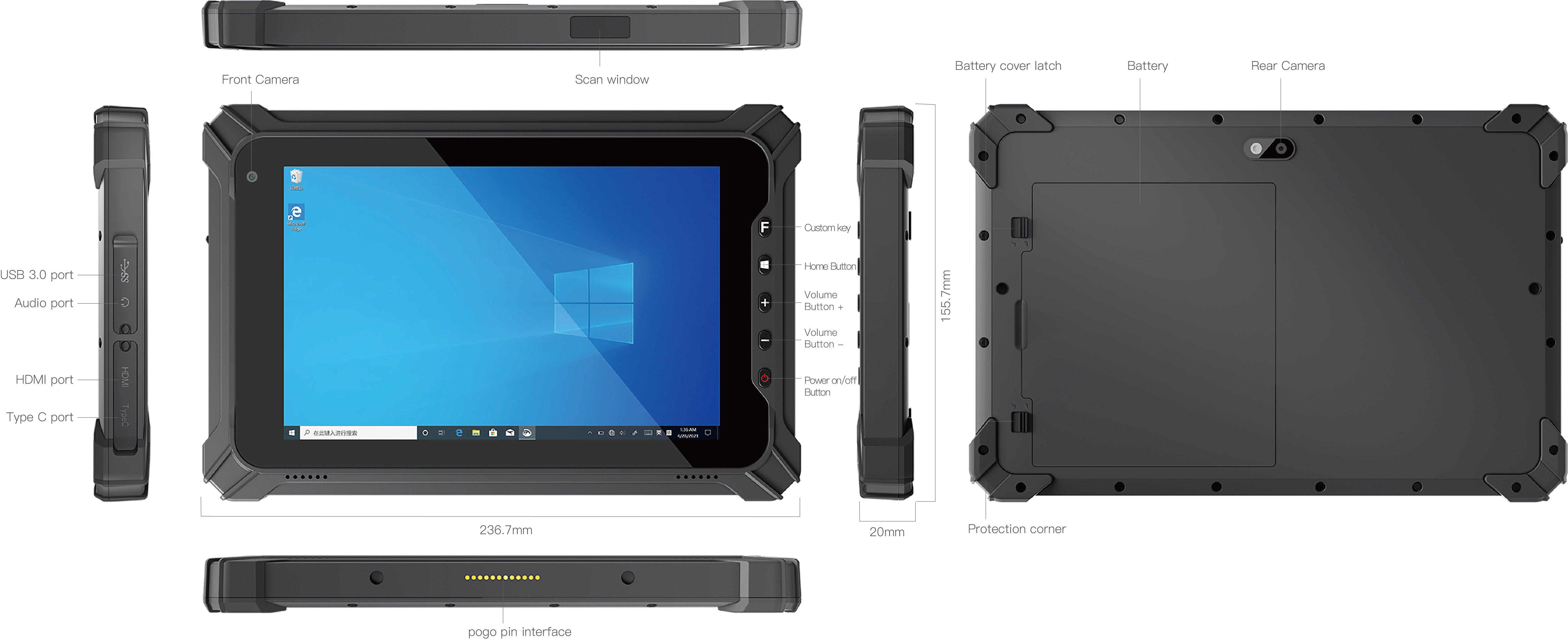 *Lze dokoupit dokovací stojan pro nabíjení tabletu a náhradní baterie, na zadní straně s porty USB, COM a LAN.