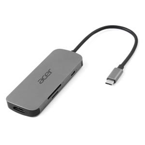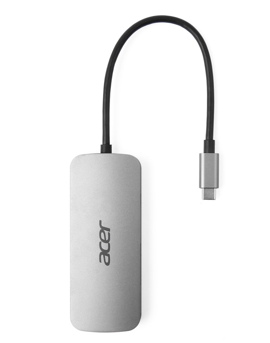 Acer 7in1 Type-C dongle: 1x HDMI (až 8K@30Hz), 3x USB-A 3.2 Gen1 (5Gbps Data Transfer), 1x SD 3.0, 1x microSD, 1x USB-C (Power Delivery max. 100W), hm. 58 g, rozměry 102 x 40 x 12,5 mm, silver