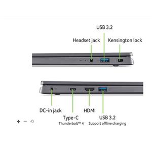 Aspire 17 (A17-51M-91JH) - Windows 11 Home - Intel® Core™ i9-13900H - 32 GB LPDDR5 Memory On Board + N/A - 1024GB PCIe NVMe SSD PM4 + N/A - 17,3" FHD 1920x1080 IPS Anti-Glare - Intel® UHD Graphics - Wifi 6E 802.11ax 2x2 MU-MIMO + BT 5.2 - FHD USB TNR Camera with 2Mic. - Backlight KB - Finger Print on Touchpad - 2x USB 3.2 Gen1 - USB Type-C port supporting: USB4 ® 40Gbps / Display port over USB-C / Thunderbolt™ 4 / USB charging 5 V; 3 A / DC-in port 20 V; 65 W - HDMI 2.1 - Copilot Key (AI) - 50Wh Li-ion battery - 65W 3mm AC Adapter - Steel Gray - Aluminium LCD cover + 30% PCR bottom cover