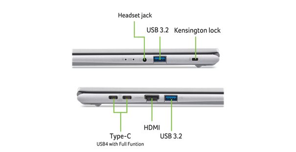 Aspire Go 15 (AG15-72P-53SS) - Windows 11 Home - Intel® Core™ 5 processor 120U - 16 GB DDR4 Memory + N (up to 2x 16 GB) - 1024GB PCIe NVMe SSD PM4 + N/A - - 15,6" FHD 1920x1080 IPS Anti-Glare 300nits - Intel® Graphics - Wifi 6 802.11AX 2x2 MU-MIMO ICPS + BT 5.0 - FHD USB TNR Camera with 2Mic. with camera shutter - 2x USB Type-C™ port supporting: USB 3.2 Gen 2 (up to 10 Gbps) / DisplayPort over USB-C / USB charging 5 V; 3 A / DC-in port 20 V; 65 W - 2x USB 3.2 Gen1 - HDMI 2.1 - Acer Sense App - Copilot Key - 53Wh Li-ion battery - 65W USB Type-C AC Adapter PCR50% TCO9.0 - Pure Silver