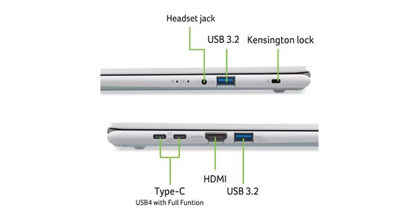 Aspire Go 16 (AG16-71P-513Y) - Windows 11 Home - Intel® Core™ 5 processor 120U - 8 GB DDR5 Memory + 8 GB DDR5 Memory - 1024GB PCIe NVMe SSD PM4 + N/A - 16" WUXGA 1920x1200 16:10 IPS Anti-Glare 120Hz 300nits - Intel® Graphics - Wifi 6 802.11AX 2x2 MU-MIMO ICPS + BT 5.0 - FHD USB TNR Camera with 2Mic. with camera shutter - Backlight KB - 2x USB Type-C™ port supporting: USB 3.2 Gen 2 (up to 10 Gbps) / DisplayPort over USB-C / USB charging 5 V; 3 A / DC-in port 20 V; 65 W - 2x USB 3.2 Gen1 - HDMI 2.1 - Acer Sense App - Copilot Key - 53Wh Li-ion battery - 65W USB Type-C AC Adapter PCR50% TCO9.0 - Pure silver