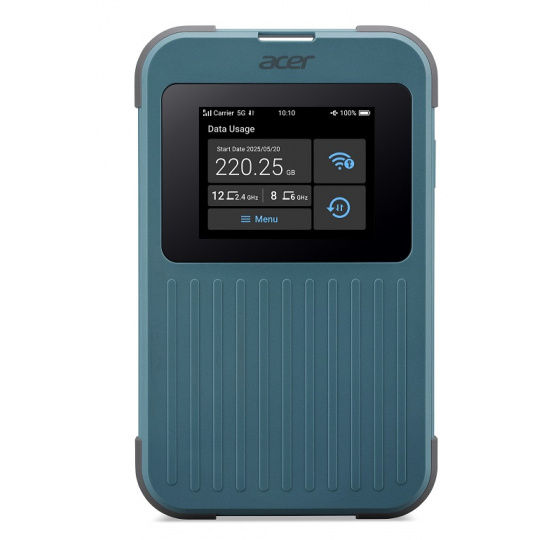 Acer Connect M4 5G - 5G<E dual connectivity mobile WiFi hotspot router, NanoSIM + eSIM + VirtualSIM (SIMO - 1GB data for free), 2,4" Color Touch displej, Mediatek Octa Core Cortex A78/A55 2.4GHz, paměť 3GB LPDDR4X, úložiště 8GB eMMC, Wifi 6 802.11 a/b/g/n/ac/ax 2x2 MIMO AX1200 pro až 16 zařízení, Dual band 2.4GHz + 5GHz nebo 2.4GHz + 6GHz, battery 8000 mAh (fast charging), Power Bank funkce, 1x USB Type-C 3.0 (USB-C kabel v balení), odolnost IP68, certifikace MIL-STD 810H, rozměry 140 x 86 x 19,1 mm, hmotnost 295g, modrozelený, bez adaptéru (doporučený: USB-C 10-15W 5V 3A)