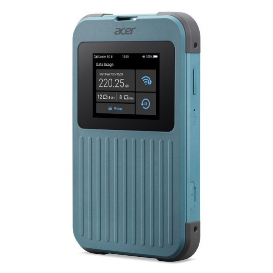 Acer Connect M4 5G with 20GB - 5G<E dual connectivity mobile WiFi hotspot router, NanoSIM + eSIM + VirtualSIM (SIMO - 20GB data for free), 2,4" Color Touch displej, Mediatek Octa Core Cortex A78/A55 2.4GHz, paměť 3GB LPDDR4X, úložiště 8GB eMMC, Wifi 6 802.11 a/b/g/n/ac/ax 2x2 MIMO AX1200 pro až 16 zařízení, Dual band 2.4GHz + 5GHz nebo 2.4GHz + 6GHz, battery 8000 mAh (fast charging), Power Bank funkce, 1x USB Type-C 3.0 (USB-C kabel v balení), odolnost IP68, certifikace MIL-STD 810H, rozměry 140 x 86 x 19,1 mm, hmotnost 295g, modrozelený, bez adaptéru (doporučený: USB-C 10-15W 5V 3A)