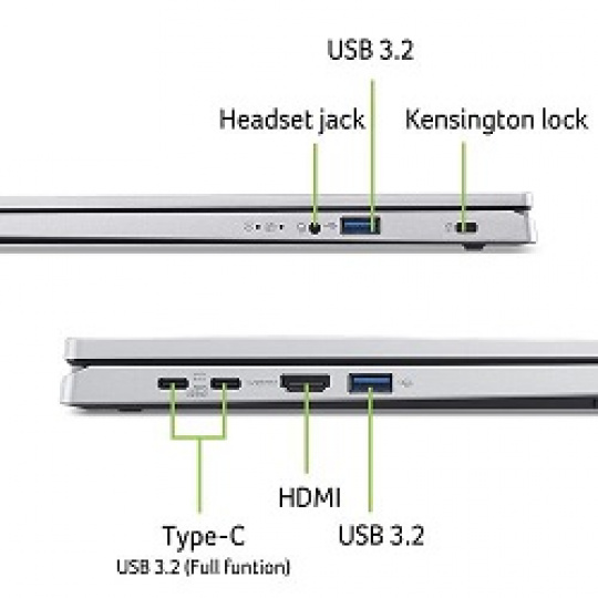 Extensa 15 (EX215-57-54F9) - Windows 11 Professional 64-bit - Intel® Core™ 5 13420H - 16 GB DDR5 Memory + N - 512GB PCIe NVMe SSD PM4 + N/A - 15,6" FHD 1920x1080 IPS Anti-Glare 300 nits - Intel® Graphics - WIFI 6E 802.11AX + BT 5.2 - HD USB TNR Camera with 2Mic. - 2x USB 3.2 Gen1 - USB Type-C port: USB 3.2 Gen 2 (up to 10 Gbps) / DisplayPort over USB-C / USB charging 5 V; 3 A / DC-in port 20 V ; 65 W - HDMI 2.1 - TPM 2.0 - Copilot Key (AI) - AcerSense app - 53Wh Li-ion battery - 65W USB Type-C AC adapter PCR50% TCO9.0 - Pure Silver