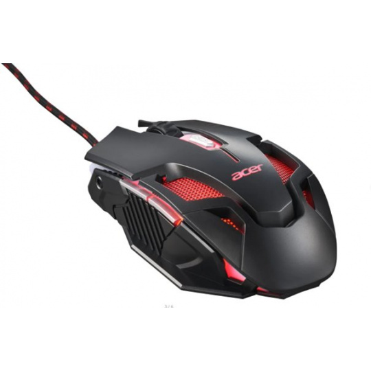 Acer NITRO GAMING MOUSE II - herní myš optická, max. 7200dpi (6 úrovní - 800-7200), 7 typů podsvícení, 6 tlačítek (2 postranní FWD, BWD), akcelerace 20G, Frame rate 7000 fps, polling rate 125MHz, životnost >3 mil. kliknutí, golden USB konektor, opletený kabel 1,8m, rozměry 128 x 73 x 50 mm, hmotnost 146g, black