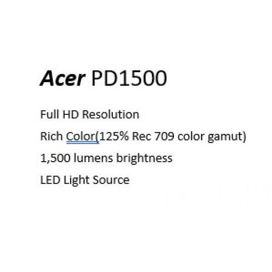 PD1500, LED, FHD (1920x1080), 1500 ANSI, 5000:1, HDMI, repro 1x5W, 2.3Kg, LumiSense, Acer Blue Light Shield, ColorSafe II, životnost lampy 20 000h, 360st projekce, nízká hlučnost 26db