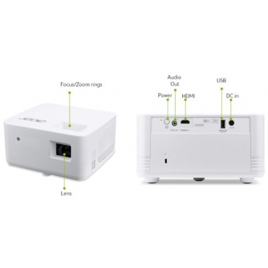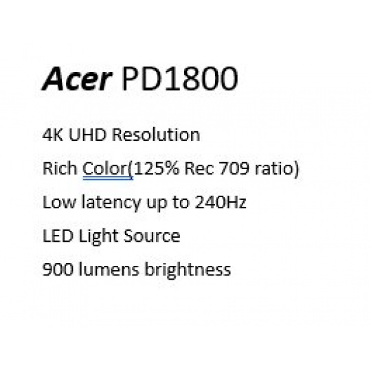 PD1800, LED, 4K UHD (3840x2160), 1000 ANSI, 8000:1, HDMI, repro 1x5W, 2.3Kg, LumiSense, Acer Blue Light Shield, ColorSafe II, životnost lampy 20 000h, 360st projekce, nízká hlučnost 26db