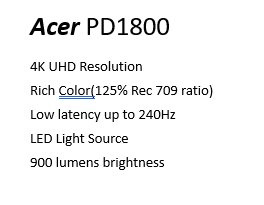 PD1800, LED, 4K UHD (3840x2160), 1000 ANSI, 8000:1, HDMI, repro 1x5W, 2.3Kg, LumiSense, Acer Blue Light Shield, ColorSafe II, životnost lampy 20 000h, 360st projekce, nízká hlučnost 26db
