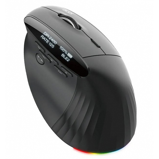 Acer Smart Fit Vertical Mouse - Black, Wireless RF 2.4GHz + BT (2x) + USB, vertikální (pro praváky), citlivost 8000 DPI (5 stupňů 1600-8000), 10 tlačítek, RGB podsvícení (11 módů), dosah 10 m, USB-C nabíjení, Li-ion baterie 850mAh, výdrž až 120 hodin, nabíjecí čas 2,5 hodiny, rozměry 118 x 79 x 59 mm, 115 g, Win/macOS/Chrome OS, retail pack