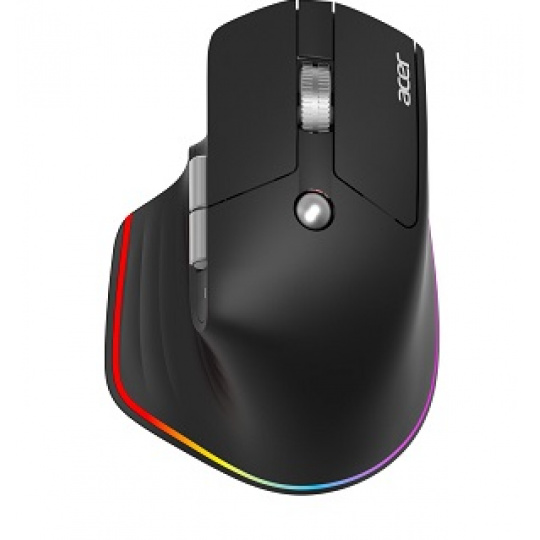 Acer Smart Fit Vertical Mouse - Black, Wireless RF 2.4GHz + BT (2x) + USB, vertikální (pro praváky), citlivost 8000 DPI (5 stupňů 1600-8000), 10 tlačítek, RGB podsvícení (11 módů), dosah 10 m, USB-C nabíjení, Li-ion baterie 850mAh, výdrž až 120 hodin, nabíjecí čas 2,5 hodiny, rozměry 118 x 79 x 59 mm, 115 g, Win/macOS/Chrome OS, retail pack