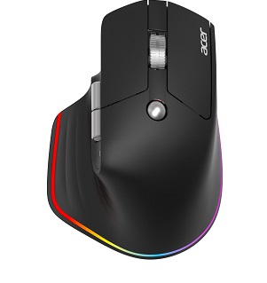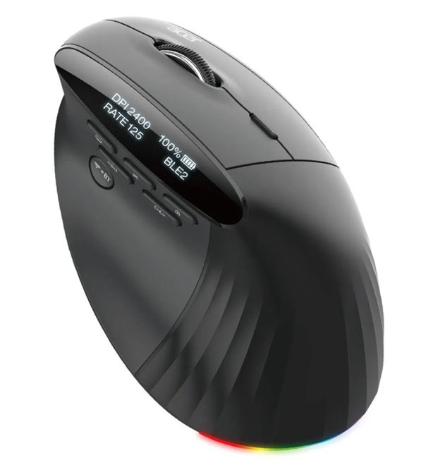 Acer Smart Fit Vertical Mouse - Black, Wireless RF 2.4GHz + BT (2x) + USB, vertikální (pro praváky), citlivost 8000 DPI (5 stupňů 1600-8000), 10 tlačítek, RGB podsvícení (11 módů), dosah 10 m, USB-C nabíjení, Li-ion baterie 850mAh, výdrž až 120 hodin, nabíjecí čas 2,5 hodiny, rozměry 118 x 79 x 59 mm, 115 g, Win/macOS/Chrome OS, retail pack