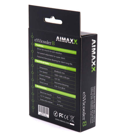 Spolehlivost, tichost a atraktivní svěží design – to jsou ventilátory AIMAXX. Všechny AIMAXX ventilátory jsou vybaveny unikátním Nanomaxx ložiskem. Toto AIMAXXem patentované ložisko je vyrobeno ze super tenkého ale extra trvanlivého materiálu a zaručuje vysokou životnost a velmi nízkou hlučnost, dosaženou malým třením. Celá série je balena v poutavém zeleno-černém balení s oknem pro snadnější prezentaci zákazníkům.