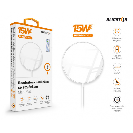 Kompaktní zpracování v elegantní bílé barvě se zářivě lesklým povrchem, praktickým stojánkem a 1m dlouhým přívodním USB-C kabelem, to je bezdrátová nabíječka Aligator Mag-Pad. Součástí balení je také feromagnetická samolepka, díky které můžete rozšířit kompatibilitu u pouzder, které tuto technologii nepodporují.