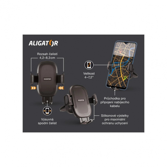 Držák do auta s nastavitelnou fixací ALIGATOR Multi do ventilační mřížky, univerzální Univerzální držák pro mobilní telefony do auta s možností nastavení fixace. Elegantní provedení nebrání řidiči ve výhledu a je kompatibilní s většinou mřížek ventilátorů. Díky speciálnímu mechanismu se přítlačné čelisti držáku roztahují pomocí tlačítka umístěného na zadní straně držáku. Naopak upevnění mobilního telefonu v držáku si manuálně uživatel nastaví přítiskem čelistí směrem k sobě, tak aby byl mobilní telefon pevně zafixován. Vycentrování mobilního telefonu v držáku zajistí manuálně výsuvná spodní čelist. Součástí spodní čelisti je průchodka pro možnost připojení nabíjecího kabelu. Pomocí utahovacího systému lze snadno úchyt připevnit k ventilační mřížce. Díky širokému rozpětí úchytu je vhodný i pro silnější ventilační mřížky. Možnost natočení mobilního telefonu v plném rozsahu 360°. Vlastnosti *Univerzální držák pro mobilní telefony do auta *Nastavitelný systém fixace mobilního telefonu *Možnost umístění do mřížky ventilace *Nebrání řidiči ve výhledu *Rozpětí ramen: 4,2cm – 8,3cm *Kompatibilní se všemi pouzdry mobilních telefonů *Kompatibilní s většinou větracích mřížek *Protiskluzová povrchová úprava ramen *Protiskluzová povrchová úprava utahovacího mechanismu úchytu *Nastavitelná (výsuvná) spodní čelist *Průchodka pro připojení nabíjecího kabelu Balení *Držák *Návod k použití