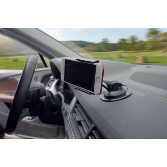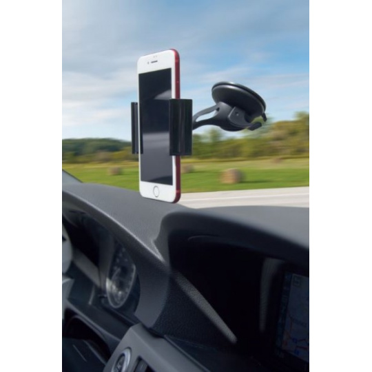 Univerzální držák pro mobilní telefony s uchycením pomocí přítlačných roztahovacích ramen. Díky tomuto přítlačnému systému lze ovládat jednou rukou. Možnost natočení mobilního telefonu v plném rozsahu 360°. Držák lze umístit na čelní sklo, ale i na palubní desku s pomocí speciální nano-podložky v balení.