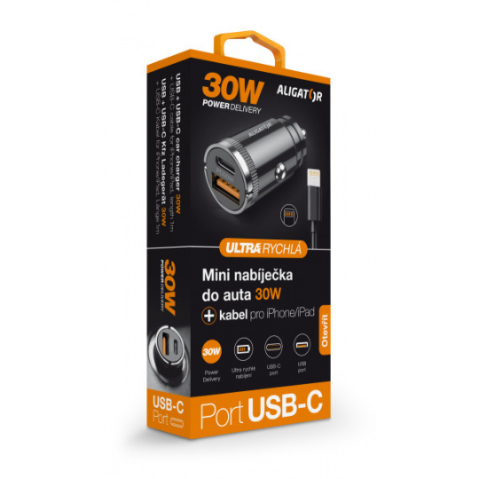 Aligator mini nabíječka do auta Power Delivery 30W,USB-C + USB-A, USB-C kabel pro iPhone/iPad