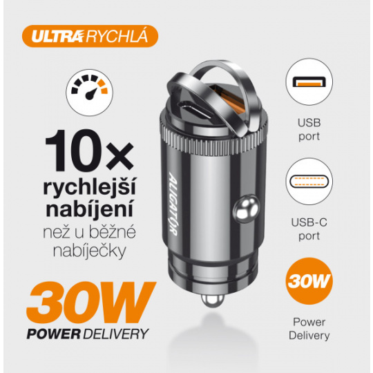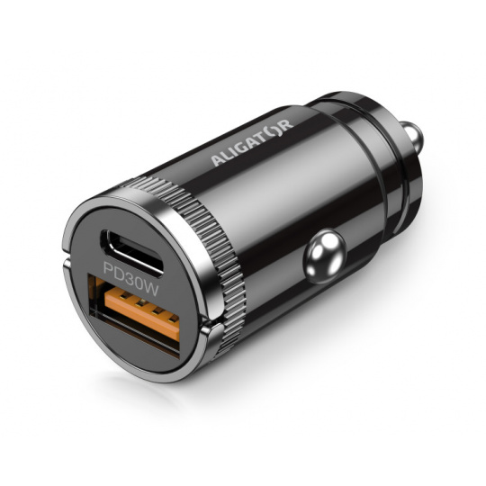 Aligator mini nabíječka do auta Power Delivery 30W, USB-C + USB-A, USB-C/USB-C kabel