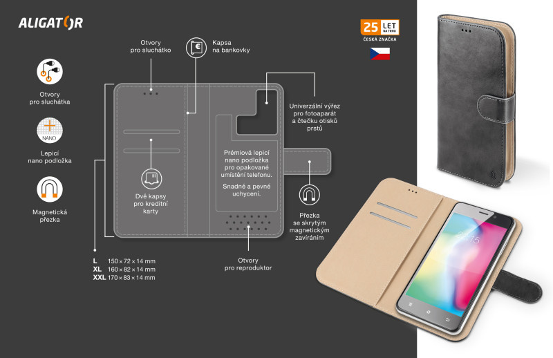 Rozměry samotného pouzdra jsou přizpůsobeny telefonům s novým poměrem stran displeje 18:9, ale zároveň jsou stále kompatibilní i s klasickými mobilními telefony.