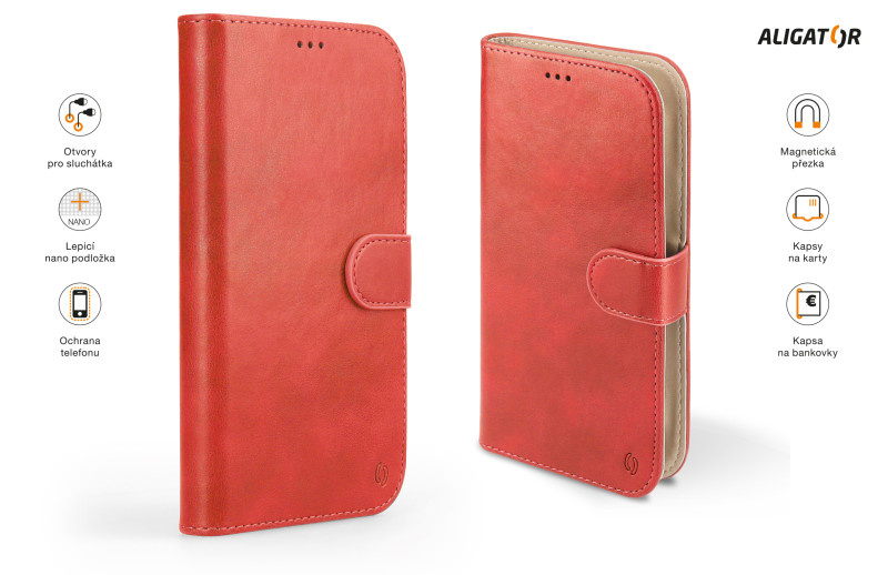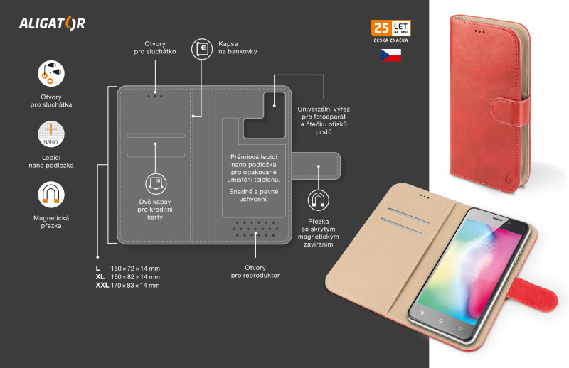 Nová řada univerzálních pouzder značky ALIGATOR. Dokonale propracovaný design, tenké provedení, přihrádka na kartu nebo vizitky, podélná kapsa na bankovky, zavírání pomocí magnetické přezky, snadné uchycení mobilního telefonu pomocí prémiové lepicí nano podložky, která je určena pro opakované umístění telefonu. Zadní výřez pro fotoaparát a čtečku otisku prstu je navržen tak, aby byl kompatibilní s většinou mobilních telefonů. Jednou z klíčových vlastností pouzdra je optimálně široký (hluboký) hřbet pouzdra, který je zároveň velmi tenký a jemně zpracovaný pro pohodlí při manipulaci. Rozměry samotného pouzdra jsou přizpůsobeny telefonům s novým poměrem stran displeje 18:9, ale zároveň jsou stále kompatibilní i s klasickými mobilními telefony. Přední odklápěcí strana je vybavena přezkou se skrytým magnetickým zavíráním. Tato přezka je navržena pro maximální ochranu Vašeho mobilního telefonu. Polstrovaná podšívka, příjemná na omak, přispívá k ochraně displeje Vašeho mobilního telefonu, stejně jako prémiová nano podložka, která zároveň skvěle fixuje mobilní telefon a slouží k opakovanému použití. Na vnitřní levé straně pouzdra najdete důmyslně skryté dvě přihrádky na kreditní kartu, nebo vizitky a jednu podélnou kapsu pro bankovky. Pouzdro UNIVERSE 20 je vyrobené z velmi kvalitní a odolné PU kůže, dostupné v 5 barvách a 3 velikostech. Je pohodlným a reprezentativním doplňkem do kapsy i do kabelky. Pro maximální ochranu Vašeho mobilního telefonu doporučujeme používat toto pouzdro v kombinaci s řadou kvalitních univerzálních tvrzených skel ALIGATOR GLASS. *Univerzální pouzdro *Zavírání pomocí magnetické přezky *Přihrádka na kartu nebo vizitky *Kapsa na bankovky *Tenké provedení *Kvalitní zpracování *Elegantní design *Snadné uchycení mobilního telefonu pomocí prémiové nano podložky *Nano podložka slouží k opakovanému umístění mobilního telefonu