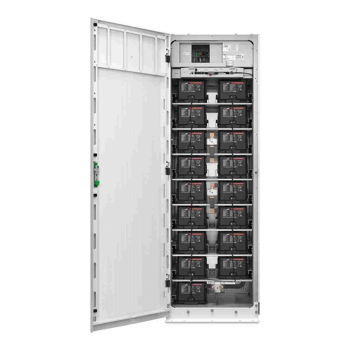 Battery cabinet that includes Lithium-ion batteries, Battery Management System (BMS), switchgear, power supply, and communication interface.