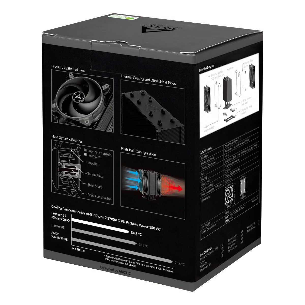 Freezer 34 eSports DUO - Věžový CPU chladič s ventilátorem BioniX P-Series v konfiguraci Push-Pull a vynikajícím poměrem cena / výkon. Se dvěma výkonnými, tlakově optimalizovanými ventilátory BioniX P a novoiu generací tepelného potažení chladiče nabízí Freezer 34 eSports DUO velkou výkonnost za přiměřenou cenu. Při zkouškách na úrovni 28 dB (A) dokázal Freezer 34 eSports DUO překonat mnoho konkurentů, dokonce i mnohem větší a dražší chladicí řešení s dvojitou věží. . Freezer 34 eSports DUO - Tower CPU Cooler with BioniX P-Series Fans in Push-Pull-Configuration Excellent Price-Performance Ratio With two powerful, pressure-optimised BioniX P-fans and its updated, thermal-coated heatsink, the Freezer 34 eSports DUO offers a lot of performance for a fair price. In internal tests levelled to 28 dB(A), the Freezer 34 eSports DUO was able to surpass many competitors, even much bigger and more expensive double tower cooling solutions. More information about our performance test and the max. CPU temperatures for AMD & Intel can be found in Cooler FAQ. New P-Fans for Increased Performance - The Freezer 34 eSports DUO benefits of all advantages of our new BioniX P-fans. High static pressure for increased cooling performance 0 db fan mode below 5 % PWM Extended RPM range Lower power consumption Fewer vibrations Extended life span High quality bearing PWM PST for synchronous fan control For additional information about the P-fans, we recommend our FAQ. Better Cooling - Better Performance No thermal throttling on your CPU - even at high turbo clock speeds and overclocking, the Freezer 34 eSports DUO cools quietly, so you can reach the maximum FPS with minimal noise levels for the smoothest possible gaming experience. Improved Heat Dissipation Evenly spread direct-touch heat pipes and an optimised heat sink design with 54 cooling fins lead to ideal heat dissipation for the Freezer 34 eSports DUO. Ideal airflow The two BioniX P-fans of the Freezer 34 eSports DUO work in push-pull-configuration The resulting increase of airflow ensures that more cold air is transported into the heatsink for cooling and the heat from the CPU is dissipated even faster from the heat sink. This ensures the best possible performance of the CPU. Thermal Coating A thermal coating creates micro-turbulences with a special surface structure. Combined with offset heat pipes this leads to an optimised heat-dissipation and to an increased cooling performance. High Performance for High-End CPU The contact surface of the Freezer 34 eSports DUO heat pipes does not cover the full heatspreader, but, more importantly, is right where the processor DIE is and covers even the largest versions (18 core) completely. MX-4 Thermal Paste Included The high-performance MX-4 thermal compound is included and ensures the best cooling results. Easy Installation & Secure Hold Fast and easy to install and extremely reliable, the Freezer 34 eSports DUO mounting system is compatible with Intel and AMD sockets. Thanks to a backplate and its low weight, the Freezer 34 eSports DUO is not only foolproof to install, but also absolutely transport safe. Optimal RAM Compatibility Thanks to its compact dimensions of only 124 x 157 x 103 mm, there are no restrictions when using RAM modules. Even RAM modules with larger heat sinks can be mounted without any issues and are not blocked by the CPU Cooler. Multilingual Manuals We offer a regularly updated user manual in many languages conveniently at your fingertips anywhere and anytime. Put the QR code sticker somewhere convenient and never waste time again looking for product instructions. Compatibility Intel Socket 1151 1150 1155 1156 2066 2011(-3) 1366 775 Yes Yes Yes Yes Yes* Yes* No No * SQUARE ILM (80 x 80 mm spacing) only AMD Socket sTR4 AM4 AM3(+) AM2(+) AM1 FM2(+) FM1 No Yes No No No No No Recommended for TDP up to: 210 W Information: Some motherboards are initially configured to allow CPU to automatically overclock. In such case, the CPU will be using more power than the announced TDP (see C’t issue 17/2017). Heatsink Direct Touch O 6 mm x 4 Aluminium Fins x 54, Thickness: 0.4 mm Thermal Coating Fan Thermal Compund: MX-4 Fan: 2 x 120 mm, 200 - 2 100 RPM (Controlled by PWM), 0 db fan mode below 5 % PWM Lager: Fluid Dynamic Bearing Geräuschpegel: 0.5 Sone Strom / Spannung: 0.13 A / 12 V DC per Fan