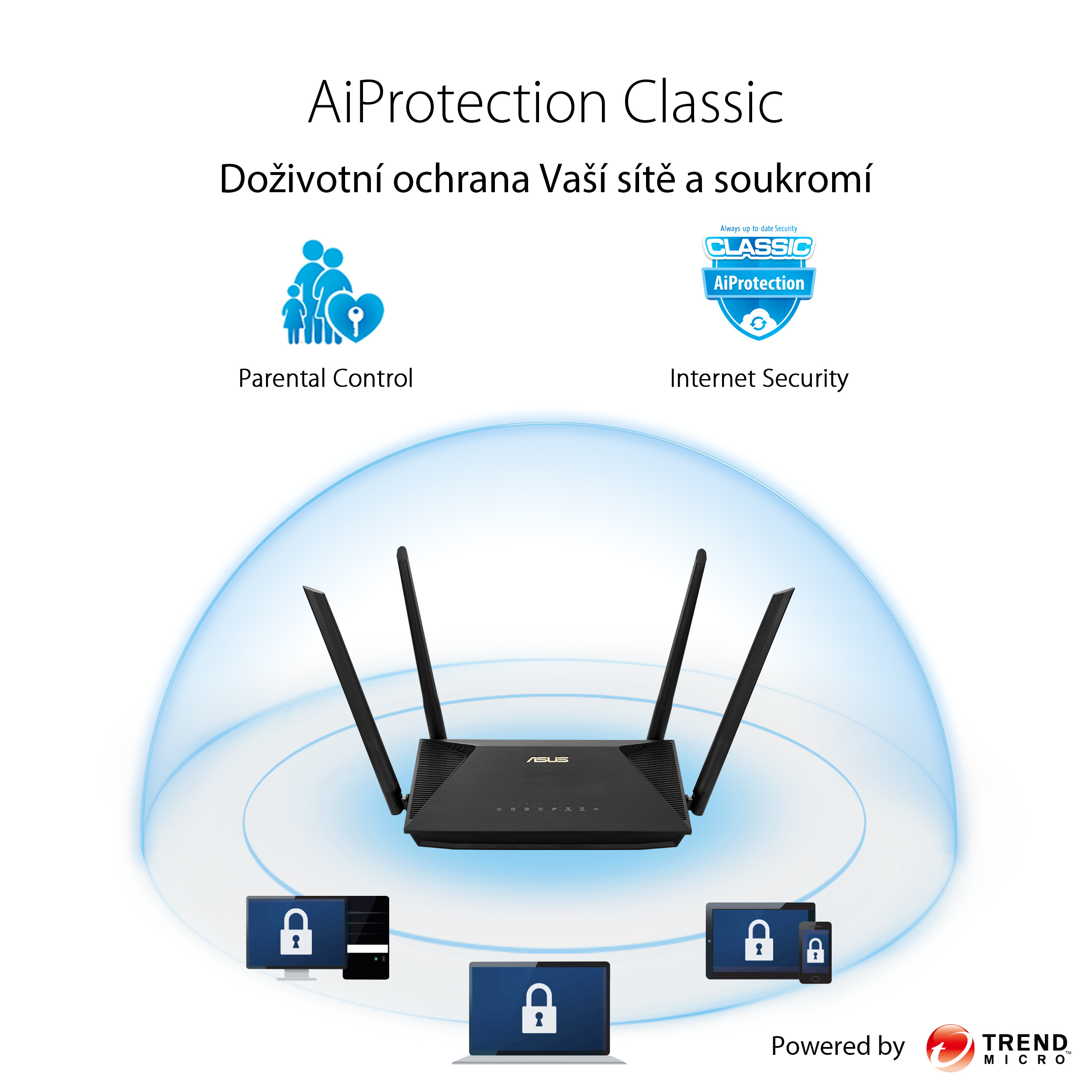 AiProtection a rodičovská kontrola - pomáhá chránit vaši síť a umožňuje nastavit časový limit pro používání sítě klientem.