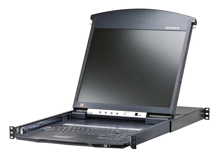 ALTUSEN KL1516 LCD KVM Switch features independently retractable, dual slide 17" or 19" LCD monitor and keyboard with built-in touchpad. A single KL1516 can control up to 16 computers. For increased reliability and efficiency, RJ-45 connectors and Cat 5e/6 cable are used to link to the computers. Utilizing KVM Adapter Cables for the final linkup, the KL1516 permits any combination of PCs, Macs, Sun computers, and serial devices to coexist on the installation.