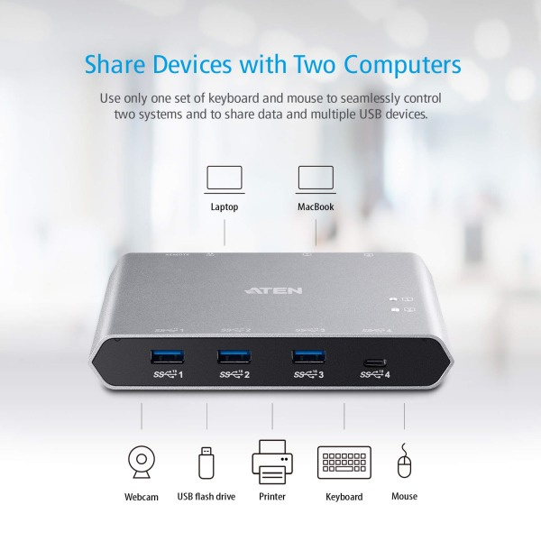 ATEN US3342 is a 4-port USB 3.2 Gen 2 peripheral sharing device that allows users to share data between four USB devices in two different USB-C enabled laptops. The US3342 is USB 3.2 Gen 2 compliant, which can support data transfer rate up to 10Gps, and also compatible with USB 3.1 Gen 1, USB 2.0 and USB1.1.