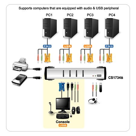 ATEN 4port KVMP USB+PS/2, USB HUB, audio, 1.2m