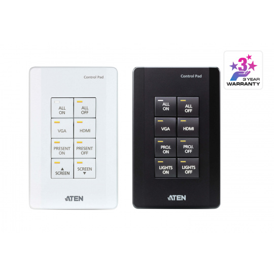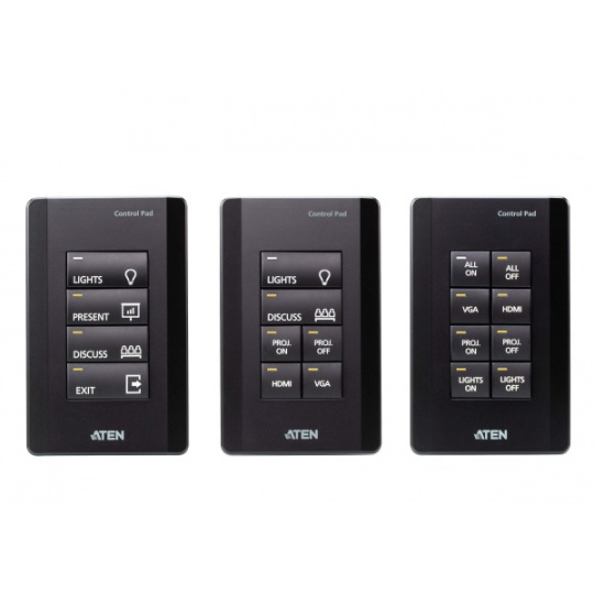 Řídicí systém ATEN je systém správy založený na Ethernetu, který propojuje všechna hardwarová zařízení nacházející se v místnosti pro centralizované řízení bez námahy. Ovládací panel VK0100 hraje nejen roli hlavního ovladače, který propojuje hardwarová zařízení, ale funguje také jako ovládací rozhraní s přizpůsobitelnými tlačítky a rozložením. Podložka Control Pad s jedním tlačítkem byla vytvořena s ohledem na flexibilitu a lze ji rozvrhnout do 14 různých kombinací 4 až 8 tlačítek, které se do sebe zaklapnou stejně snadno jako stavebnice Lego. Po připojení k místní síti uživatelé zjistí, že pomocí softwaru VK6000 lze bez námahy konfigurovat požadované ovládání jakéhokoli připojeného zařízení z podložky Control Pad. S kombinovanou podložkou Control Pad připravenou k použití získáte okamžité a inteligentní ovládání zařízení z podložky Control Pad, která dokáže spravovat jakékoli zařízení v místnosti.