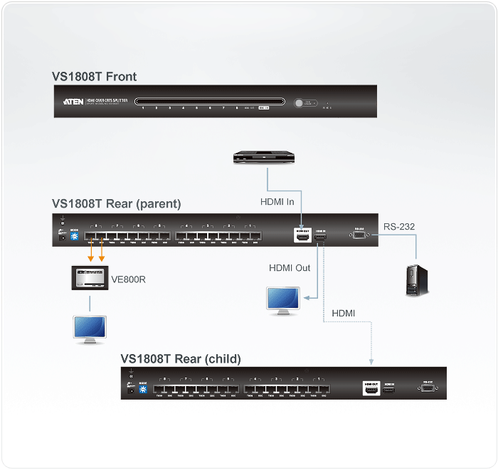 ATEN 8 port HDMI rozbočovač po Cat 5e kabelu, RS-232