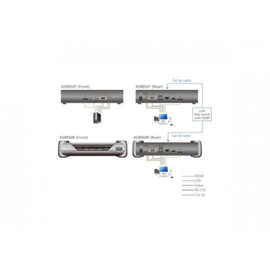 KE8950 využívají odborné znalosti v oblasti řešení KVM přes IP a jsou to extendery HDMI KVM založené na protokolu IP, které umožňují přístup k počítačovému systému ze vzdálené konzole USB kamkoli přes intranet. Extendery KE8950 KVM over IP podporují na každém konci jeden monitor HDMI a poskytují výrazně lepší obraz s rozlišením videa 4K x 2K (až 3840 x 2160). KE8950 také podporuje rozšíření optických modulů SFP o rychlosti 1 Gb/s, což umožňuje připojení přes optickou síť a prodloužení vzdáleností při přenosu.
