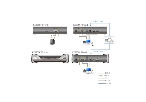4K HDMI KVM over IP Extender se skládá z vysílací jednotky, která se připojuje k počítači, a přijímací jednotky, která zajišťuje přístup ke konzoli z jiného místa. Přístup k počítači ze vzdálené konzoly je zajištěn prostřednictvím standardní sítě TCP/IP prostřednictvím kabelu Cat 5e/6, který umožňuje správu mezi dvěma body, mezi dvěma body, mezi více body a mezi více body. KE8950 lze připojit buď přímo k sobě, nebo prostřednictvím vysokorychlostní sítě, a to přes měděnou nebo optickou síť LAN.