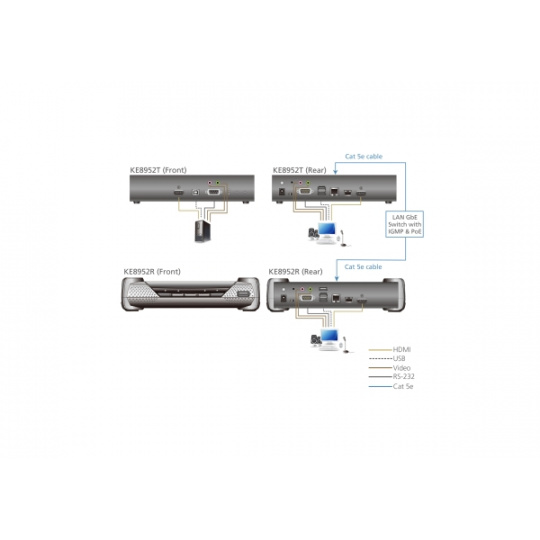 Aten KE-8952 zarízení (skládá se z vysílací KE8952T a prijímací KE8952R jednotky) umožnuje vzdálené ovládání pocítace/pracovní stanice nebo KVM prepínace pres pocítacovou sít. Podporuje prenos digitálního videa HDMI, audia, USB klávesnice a myši. Navíc podporuje i ovládání pres RS-232 port a je možno do nej instalovat i modul SFP pro optické propojení s jiným zarízením/pocítacovou sítí. Umožnuje navíc PoE (power over Ethernet) funkce.