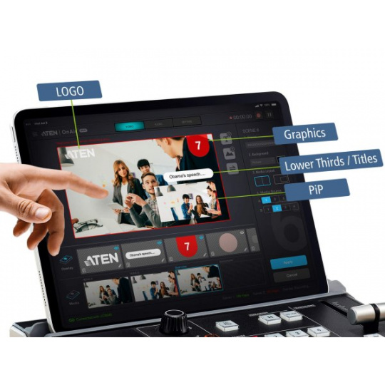- Intuitivní a výkonná aplikace - přednastavte až 8 scén s vlastním rozložením videa, náhledem a monitorováním programů na celou obrazovku, editací v reálném čase, přechody v ohromujících vizuálních efektech DVE, PbP nebo PiP a grafickými a textovými překryvy pro profesionální povrchovou úpravu