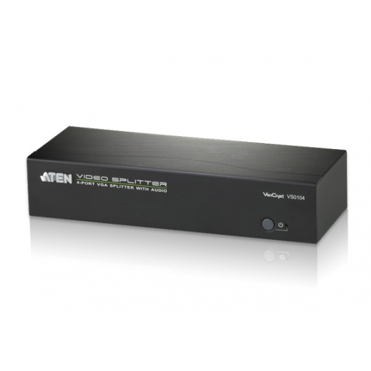 ATEN VS0104 4portový rozbočovač VGA se zvukem je rozbočovač VGA, který umožňuje distribuci jediného video a audio signálu VGA na čtyři výstupní displeje s nezávislým stereofonním ovládáním. Rozdělovač podporuje až 450MHz šířku pásma videa, což zajišťuje optimální kvalitu obrazu, podporovanou rozlišením až 1920x1440.