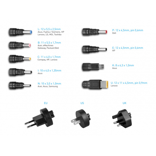 Výstupní napětí 18,5 - 20V, výkon 45W, 9x konektor, napájecí kabel, EU, US a UK zástrčky.
