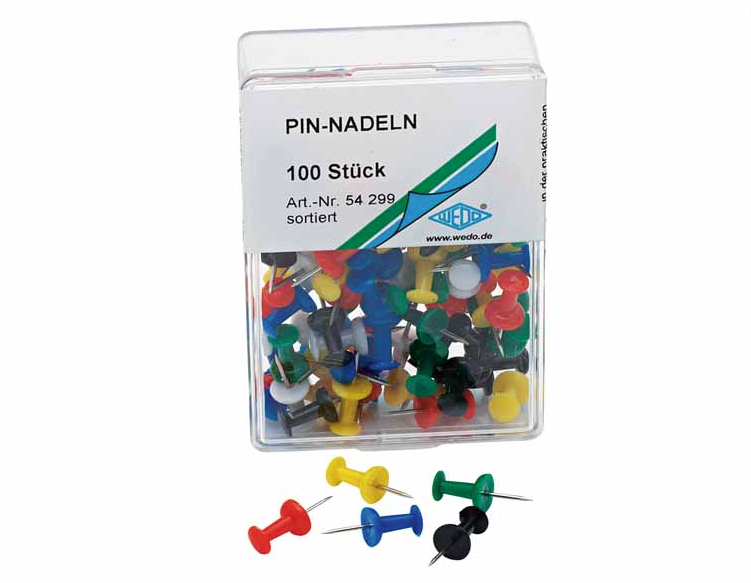 Špendlíky s kovovým hrotem a plastovou hlavičkou pro použití k přichycení dokumentů na korkové tabule a nástěnky.