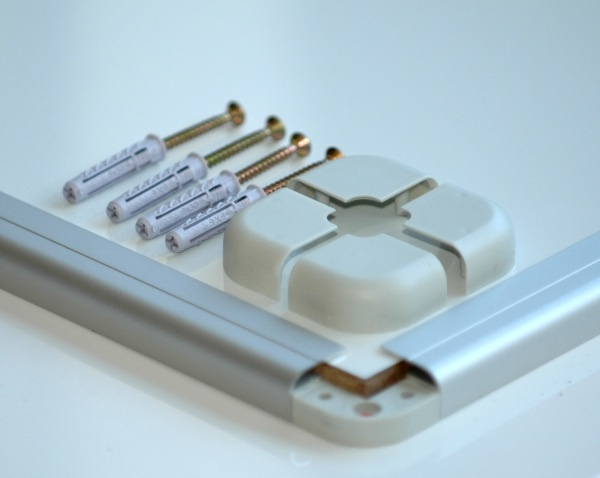 Světle šedé plastové rohy sladěné s rámem tabule