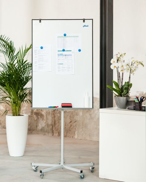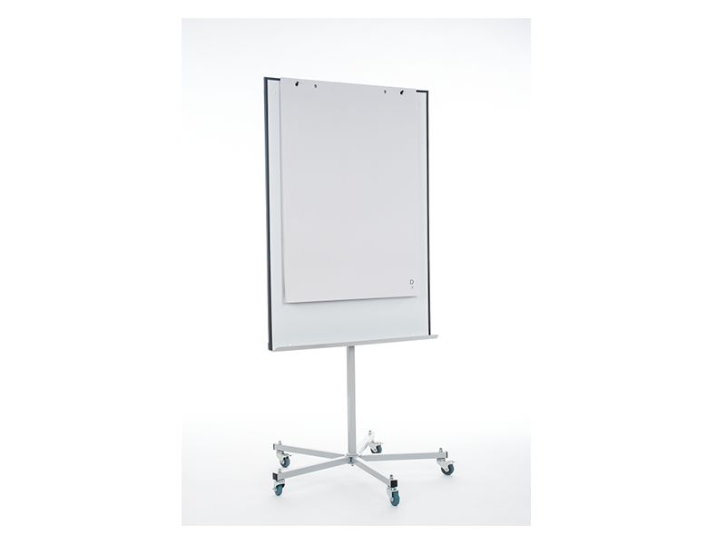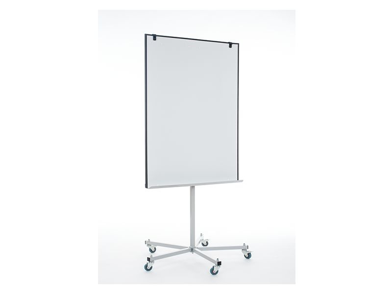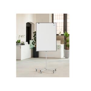 Mobilní skládací flipchart s magnetickým povrchem. Má velmi stabilní základnu s pěti kolečky a ručně nastavitelnou výšku.