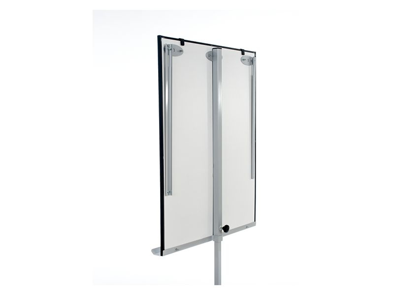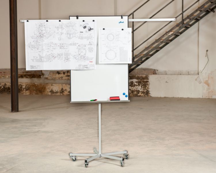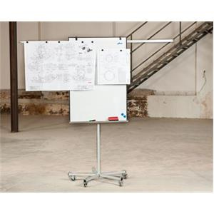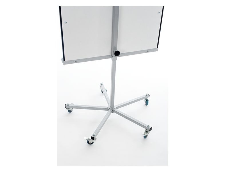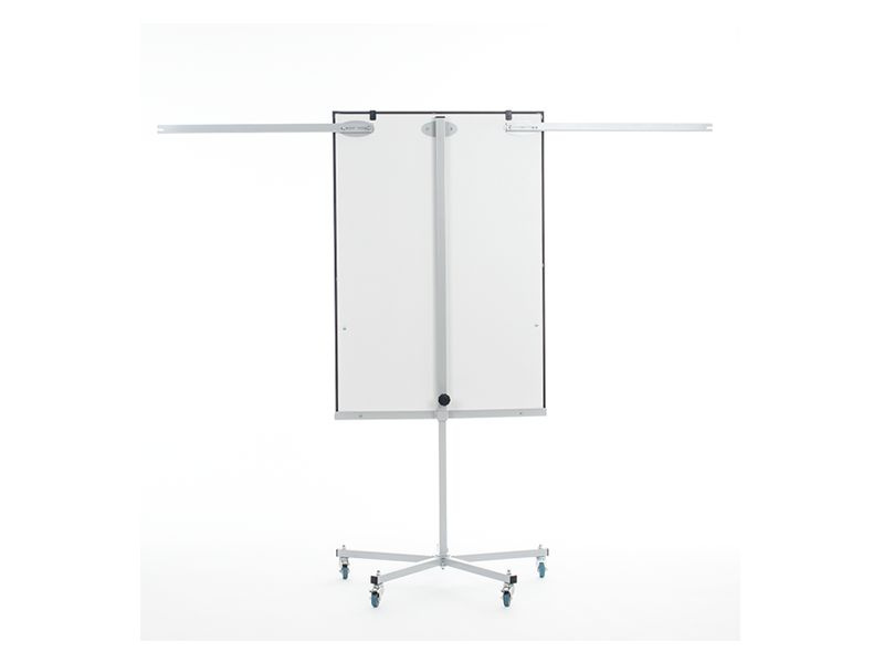 Mobilní skládací flipchart s magnetickým povrchem. Má velmi stabilní základnu s pěti kolečky a ručně nastavitelnou výšku a dvě výsuvná ramena.