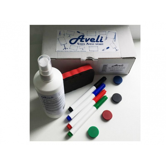 "Základní sada pomůcek k popisovacím tabulím. Sada obsahuje: 4 barevné popisovače na bílé tabule, čistící 250 ml sprej, 6 kulatých magnetů o průměru 24mm , 1 magnetická stěrka.